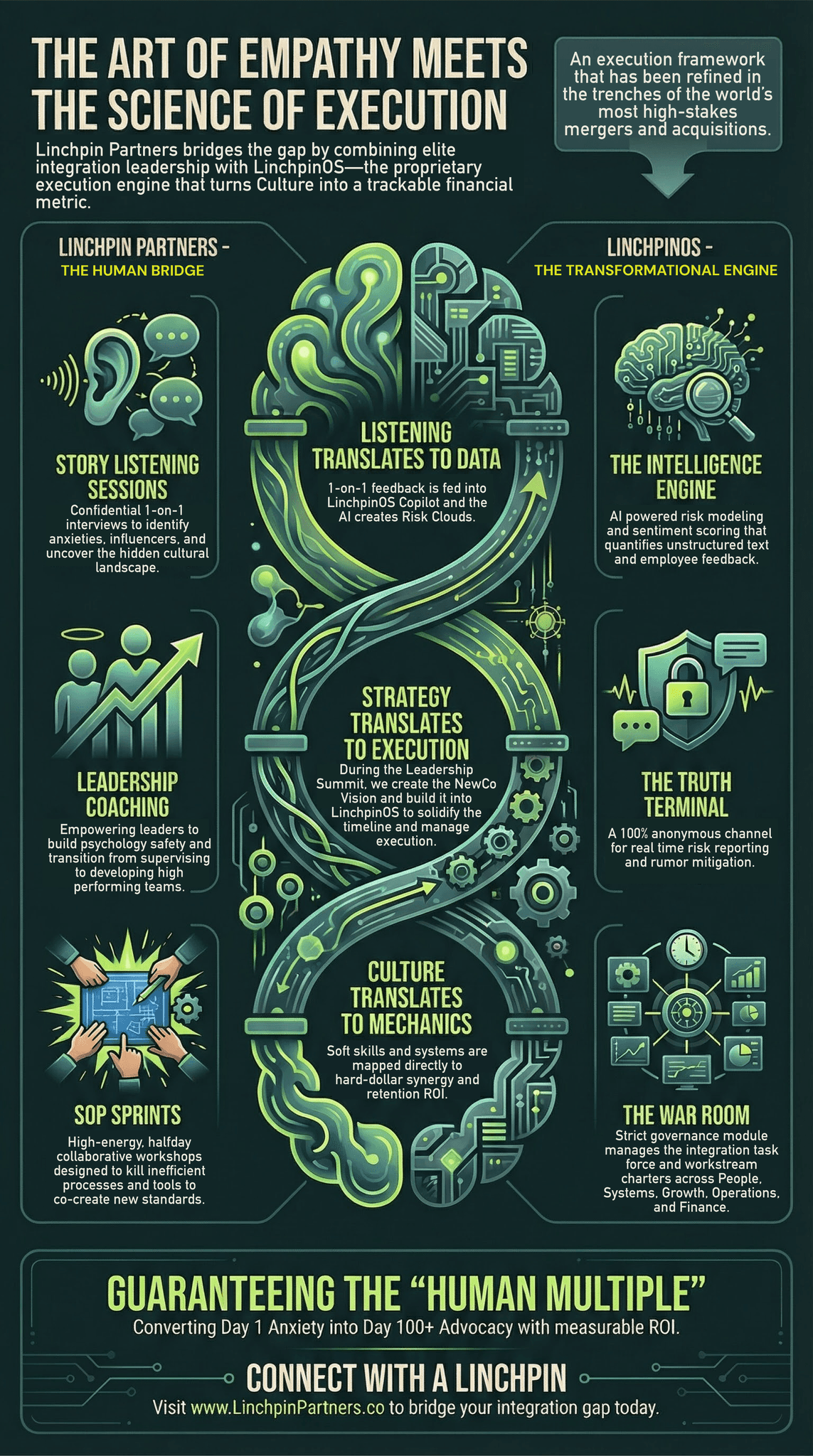 We built LinchpinOS—the world's first Autonomous Integration Office (AIO)—to be the tool we wish we had when our own reputations and legacies were on the line. We don't sell advice; we sell an execution framework that has been refined in the trenches of the world’s most high-stakes acquisitions.
